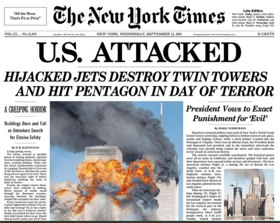 And then I saw something I couldn’t believe was real… I didn’t believe my own eyes at first, but this was no movie. Real people jumping out of skyscrapers. Planes crashing into buildings. The whole world collapsing. Fear. Sorrow. Pride in my people who stood up under such terrible circumstances. Pain for all those who still carry the consequences of that day.